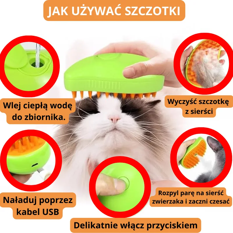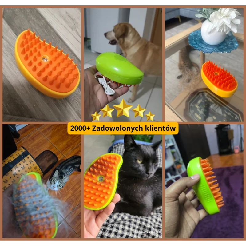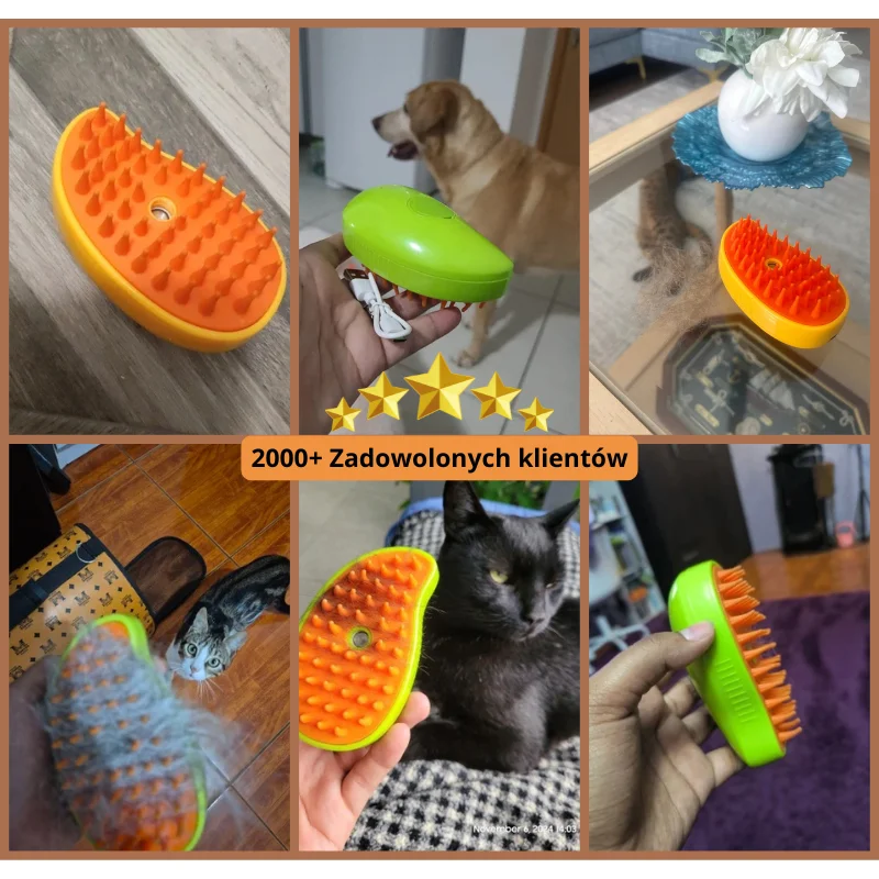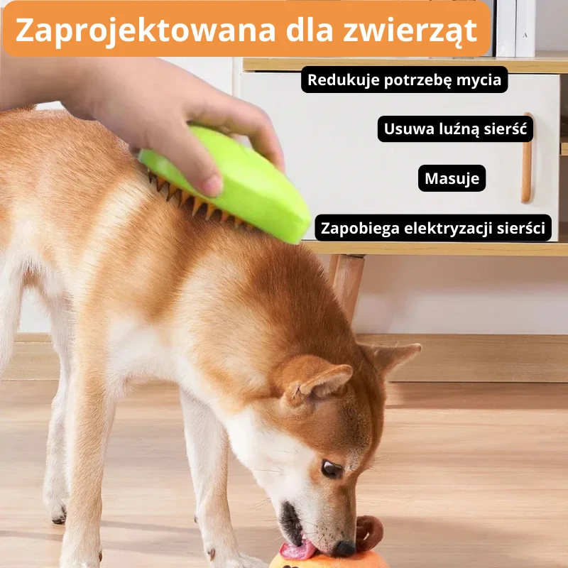 UWIELBIAM TĘ PAROWĄ SZCZOTKĘ DLA PSA!! Mój pies wcześniej nienawidził być czesany suchą szczotką, a sierść latała wszędzie! Jednak dzięki tej masującej szczotce do usuwania sierści z funkcją pary mogę nie tylko szybko i skutecznie usuwać sierść mojego psa, ale też nie unosi się ona w powietrzu. PIES uwielbia parę, która dodatkowo może pomagać usuwać zarazki i brud z jego futra. Końcówki masujące w szczotce zapewne wspierają krążenie, podobnie jak masaż skóry głowy u ludzi! NIESAMOWITE!